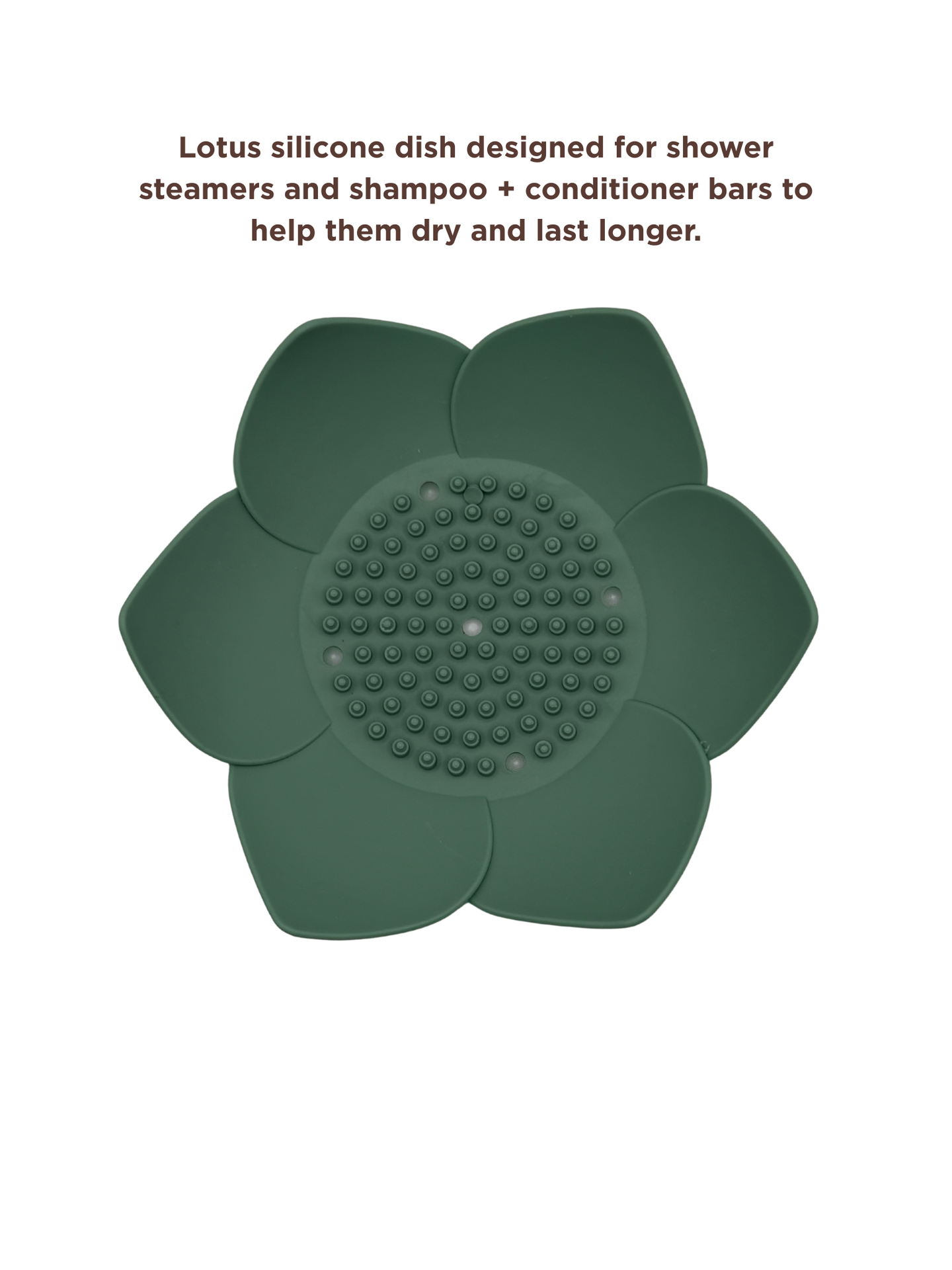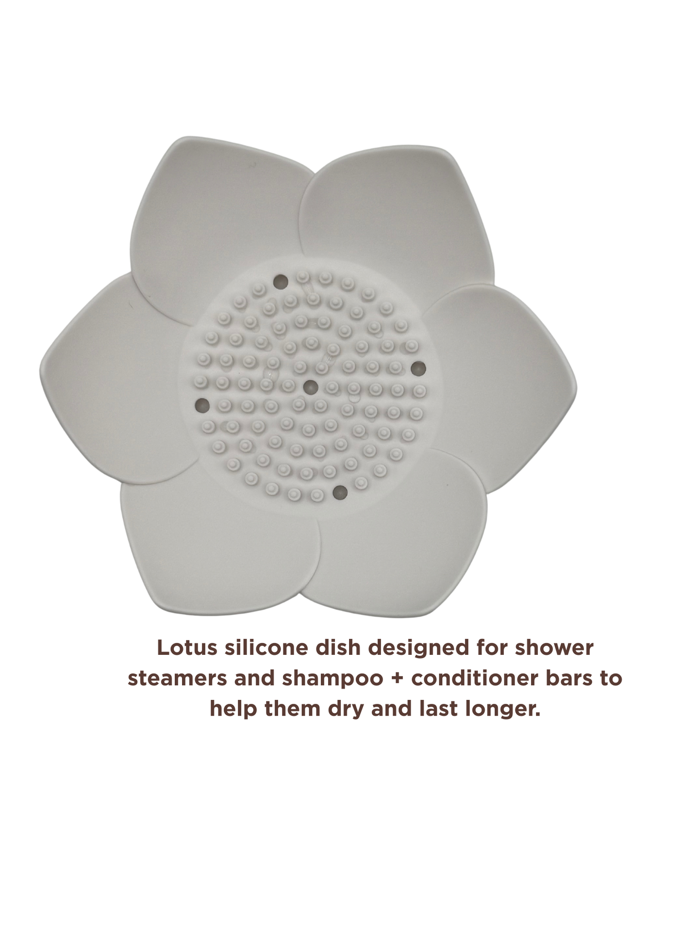 Keep your shower essentials dry and lasting longer with this flexible lotus-shaped silicone dish. Designed with raised “petals,” it allows water to drain away and air to circulate around your shower steamers, shampoo bars, and conditioner bars, helping them dry between uses.