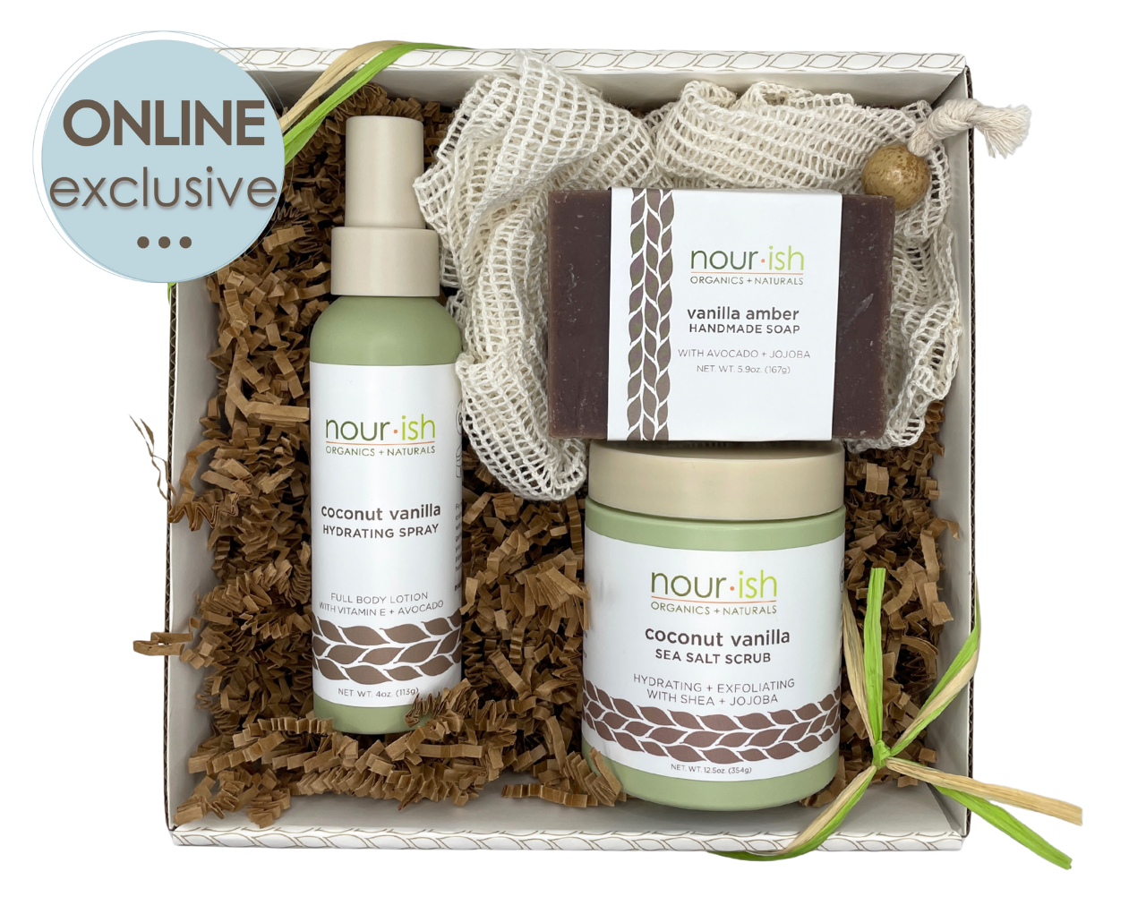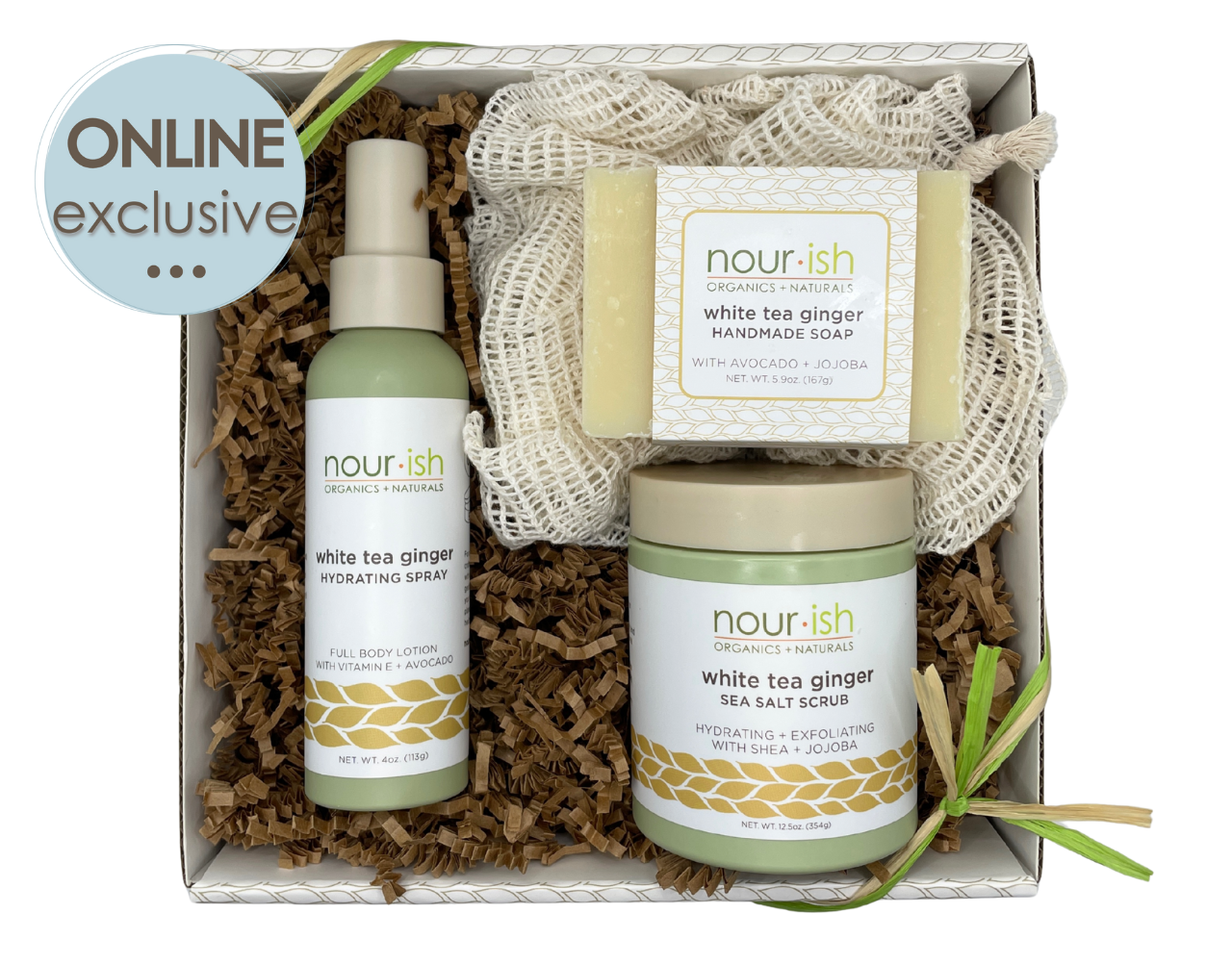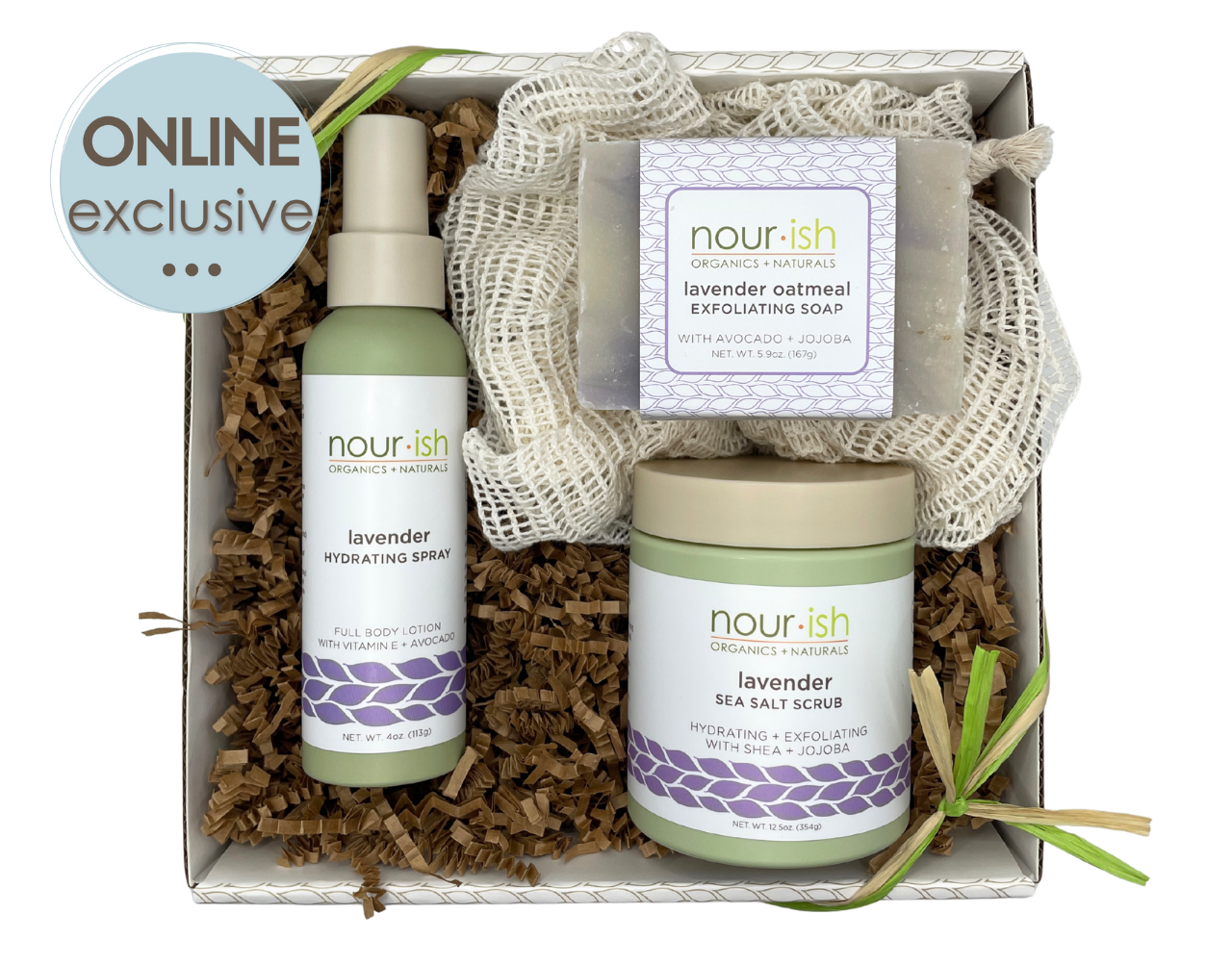 This gift set includes a Hydrating Spray Body Lotion, a bar of Handmade Soap, a 12.5 oz Salt Scrub, and a Ramie Bath Sponge.