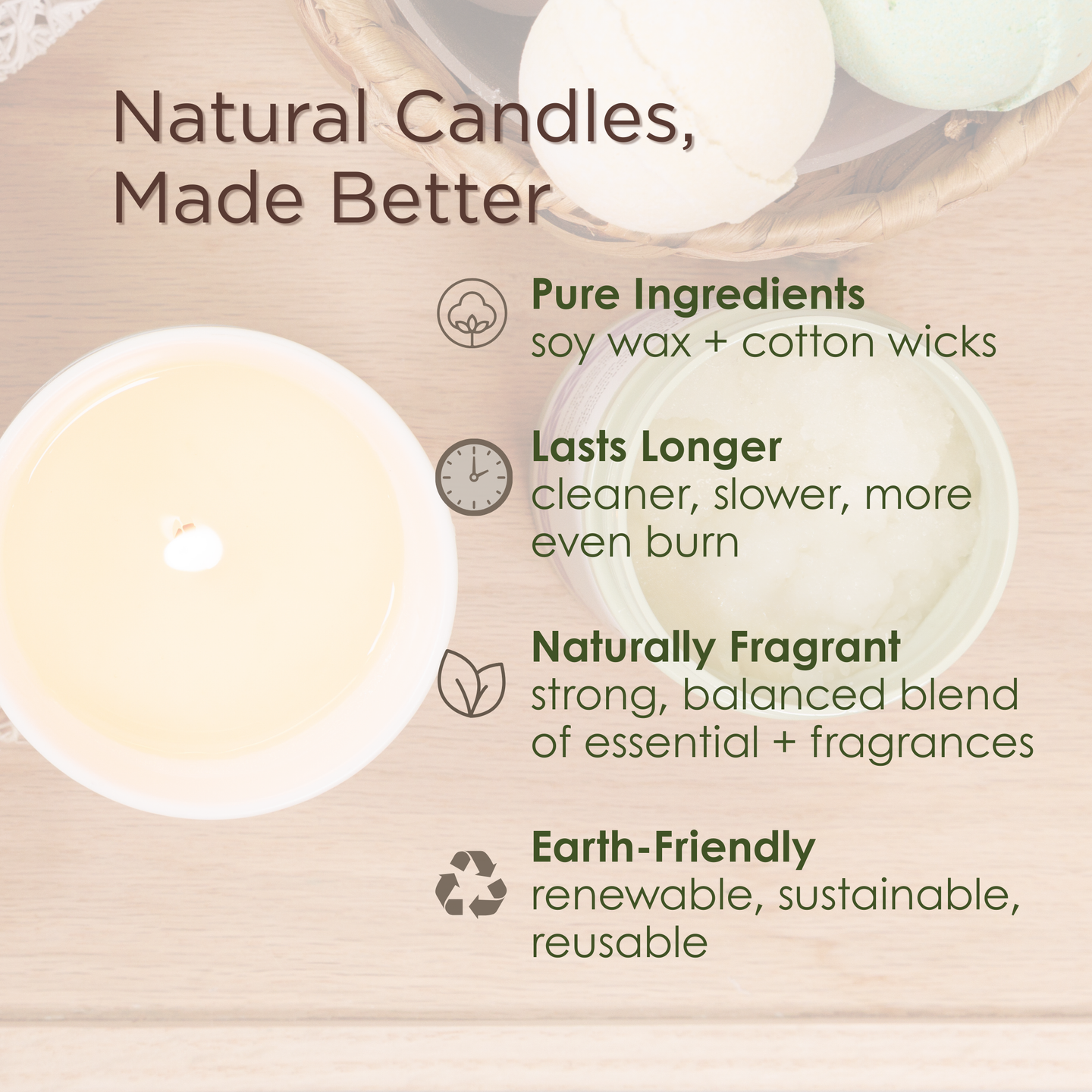 • Eco-Friendly – renewable, biodegradable soy wax