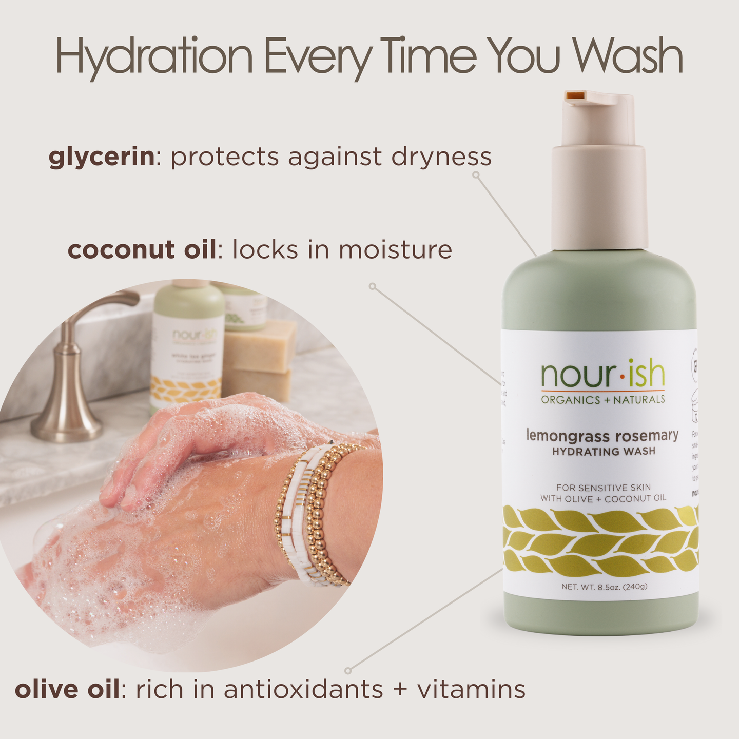 Nothing smells fresher than lemongrass or warmer than rosemary! Since the essential oils are naturally antimicrobial, we can keep our soap effective with pure ingredients like distilled water and nourishing coconut oil. Try it as a body wash, too!