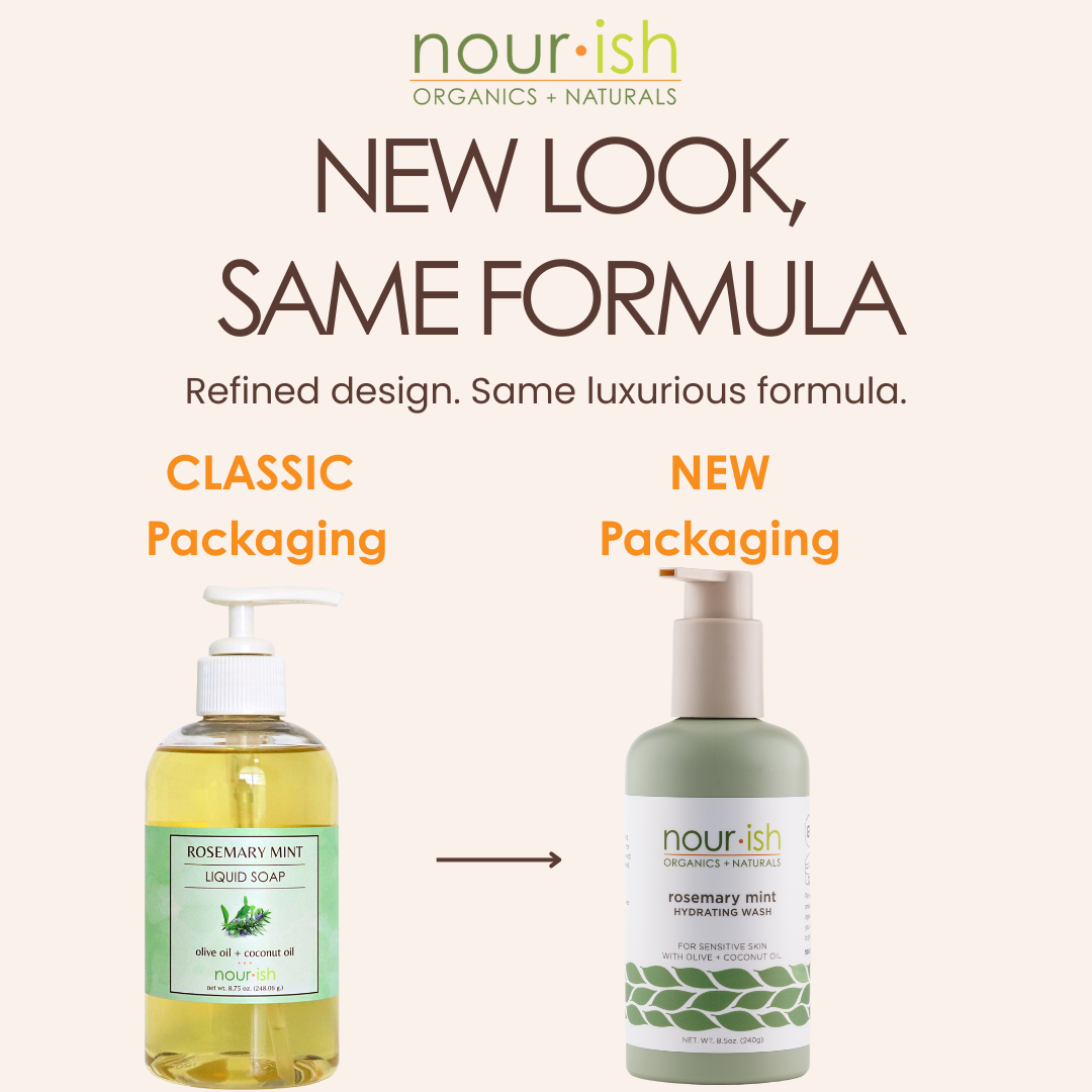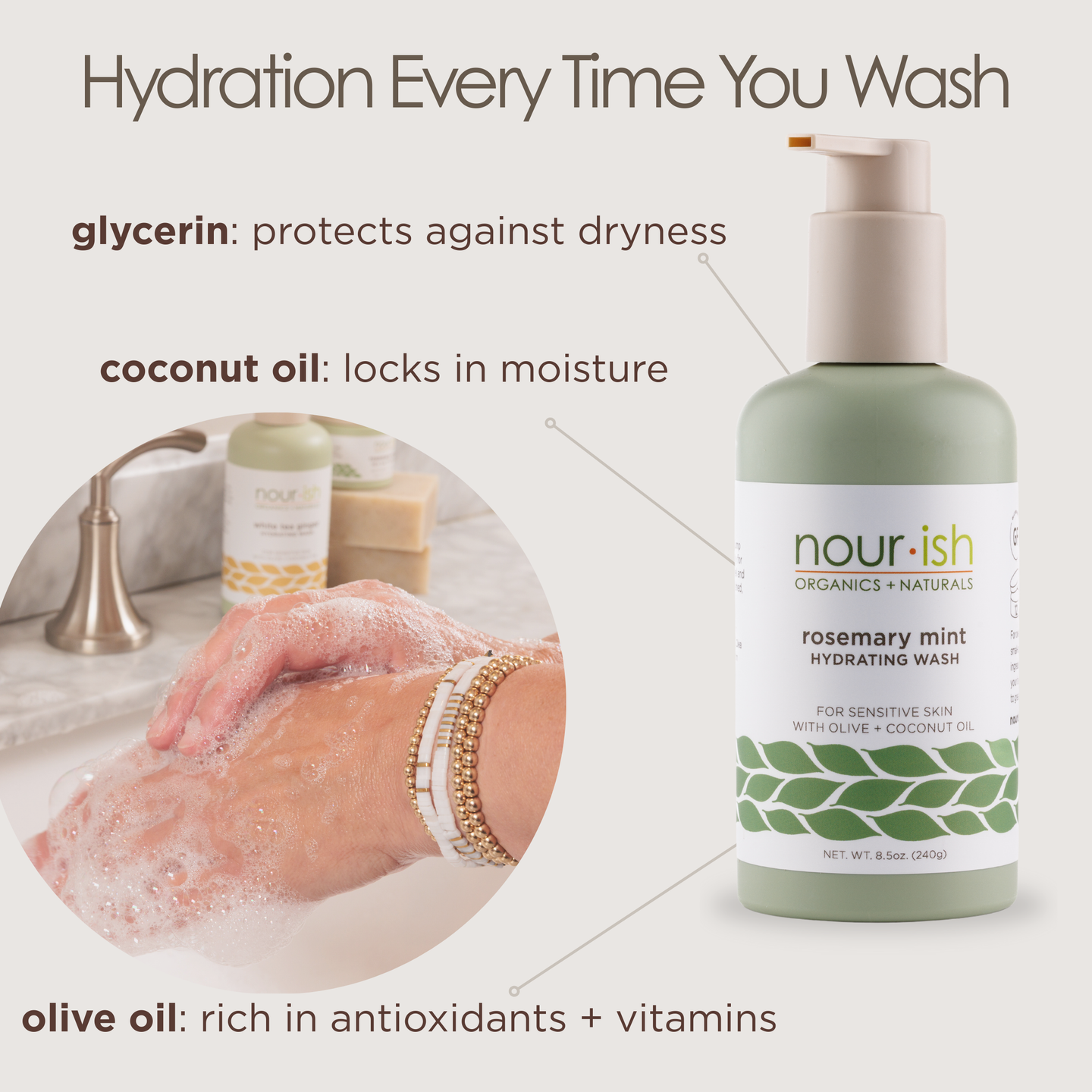 Olive and coconut oils create a moisturizing, antioxidant-rich blend, while rosemary and mint essential oils soothe your nose and your skin. Perfect at the sink, in the shower or even as shampoo, where the rosemary can promote circulation throughout your scalp.