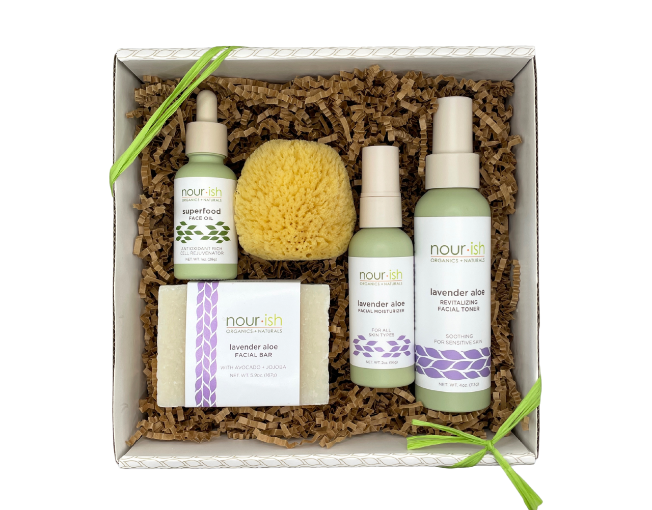 Included items: Lavender Aloe Facial Bar, Lavender Aloe Facial Moisturizer, Revitalizing Facial Toner, Superfood Face Oil, and Caribbean Silk Facial Sponge.