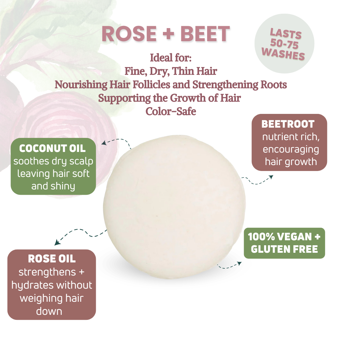 Do you want healthy and shiny hair? Well... "beet" your friends to it with this strengthening Shampoo Bar, then share the love with them! Great for fine hair types. Rose Essential Oil helps strengthen hair and follicles while hydrating the scalp and hair without weighing it down. Beetroot powder is high in potassium and iron which feeds the scalp nutrients that promote the growth of strong healthy hair.
